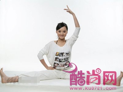 瘦腰运动动作1:双腿最大限度分开坐,拉伸大腿筋脉,双手放在大腿根处,吸气收腹。伸一只手臂高举头顶上方。