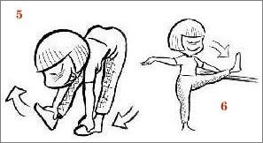 六、侧弯腰(右):将一脚置于椅上,同时向异侧弯腰,头触脚,做10-15次。然后换脚做,逐日增次